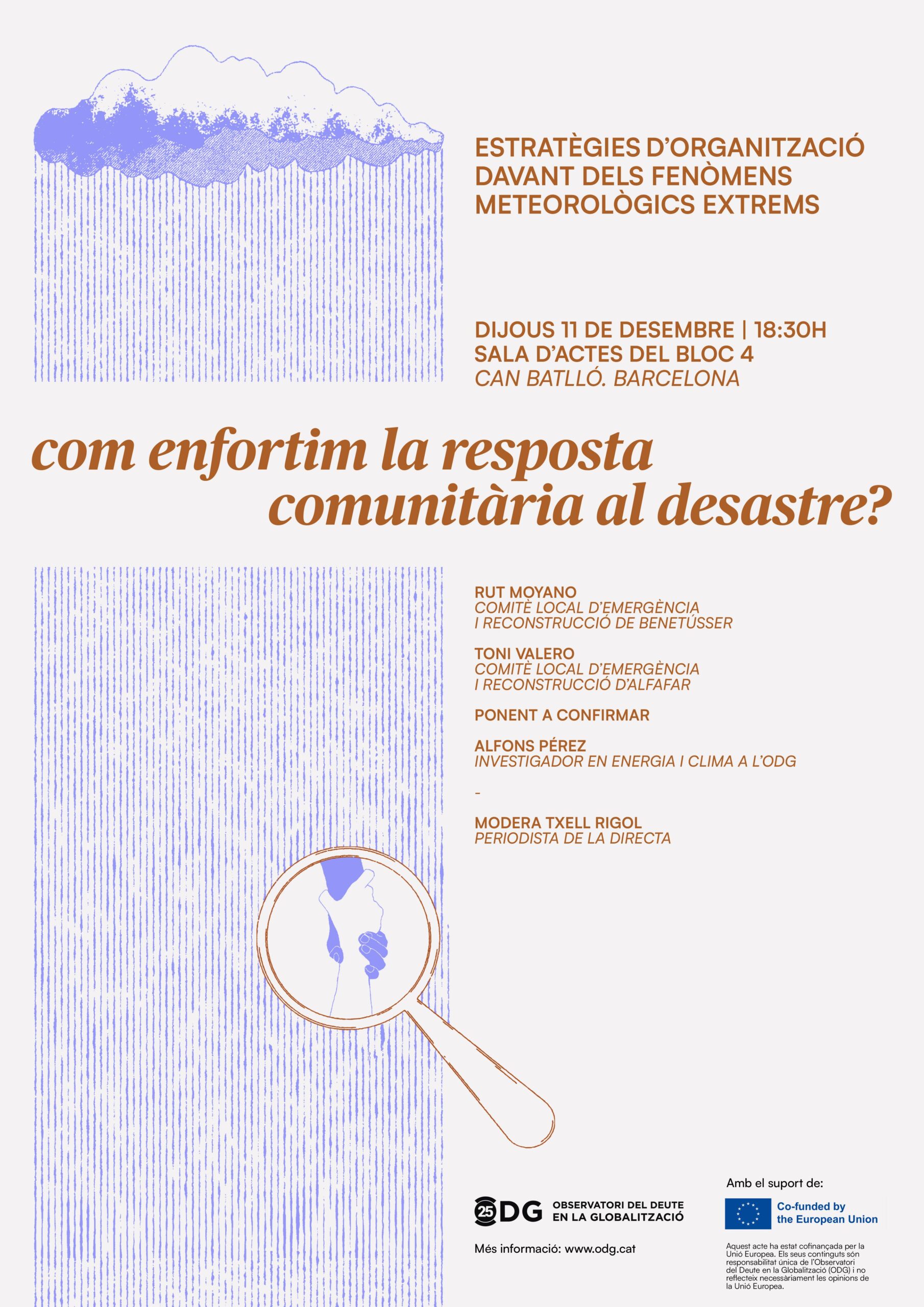 De tot això en volem parlar en l’esdeveniment “Com enfortim la resposta comunitària al desastre?”. Volem crear un espai per compartir aprenentatges, errors, preocupacions i desitjos, que pugui iniciar un debat sobre el paper dels moviments, les organitzacions i les entitats socials davant les emergències.